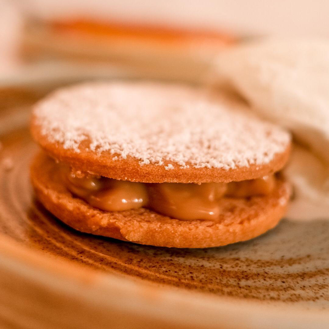 shortbread cookie sandwich, dulce de leche, icing sugar